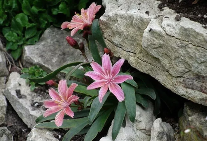 Левізія Твіда (Lewisia tweedyi) формує вічнозелену розетку (діаметром 20 см). Рослина на коротких стеблах. У травні можна насолоджуватися пастельними квітами діаметром 5 см.