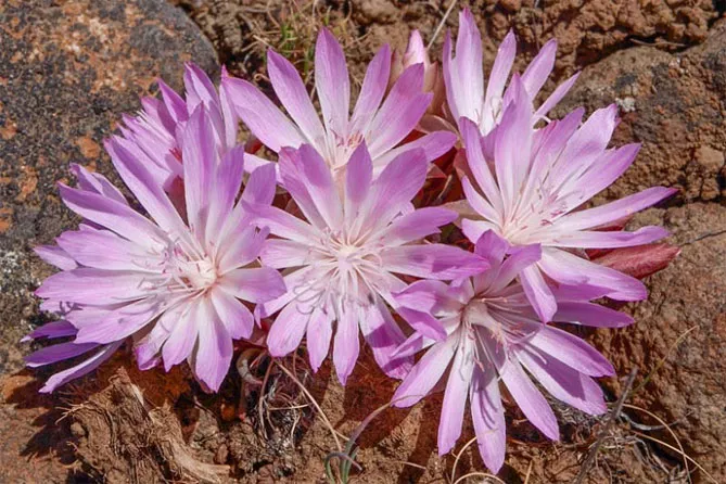 В середині літа листя всихає, і тільки потім починається цвітіння. Рослина утворює яскраві великі квіти (діаметром 5 см), що ростуть на коротких стеблах.