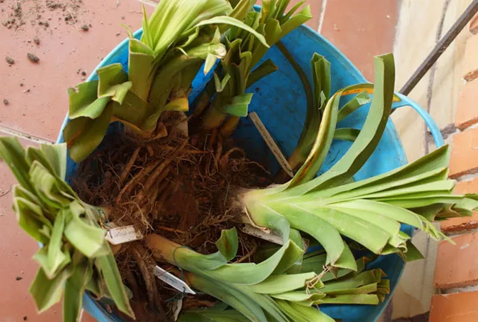 Потім кожну частину більш делікатно розбираємо на саджанці. На кожному садженці лілейника має залишитися хороше кореневище з коренями та столонами. Листя та стебла у садженця обрізаємо секатором.