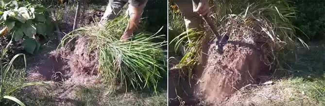 Кущ лілейника обкопується акуратно навколо. Потім гострим ножем робиться розріз кореневища на частини з окремими стеблами. Якщо кущ дуже старий, розрослий, кореневище стає величезним. Тоді доведеться рубати ком з кореневищем лопатою на частини.
