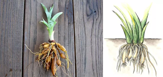 Коріння лілейника м'ясисте, часто утворює столони, які іноді називають цибулинами.