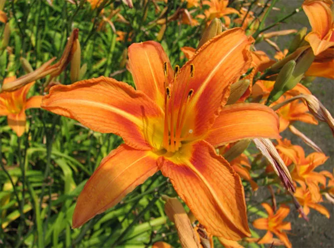 - Лілейник буро-жовтий латинською мовою Hemerocallis fulva виробляє помаранчево-червоні квіти. Дає багато квітів, до 12 на одному пагоні. Вони мають більш грудкоподібну форму, великі квіти. Рослина виробляє багато листя, яке може виглядати досить трав'янистим, тому варто посадити декоративні трави поруч із цією рослиною.