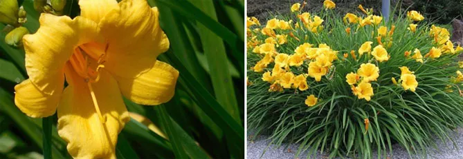 - Лілейник жовтий латинською мовою Hemerocallis flava має вигляд дещо меншої форми. Рослина виробляє жовті квіти, трохи тонші, але мають стандартний лілієподібний вигляд. Жовта лілія виробляє дуже багато пагонів і має трав'янисту крону. Окремі квіти на кінцях пагонів з'являються серед трав'янистих, досить щільних листків. Це вид, який легко вирощується, відрізняється інтенсивним, приємним ароматом квітів.