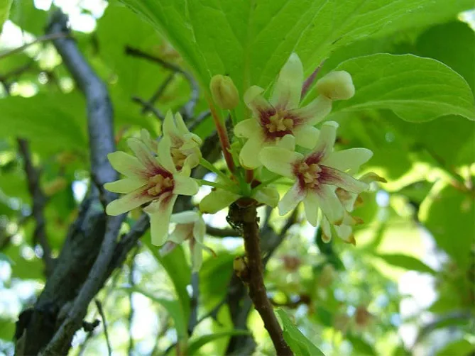 На межі травня – червня на пагонах з'являються маленькі ароматні квітки. Квітки двостатеві, чоловічі та жіночі, діаметром близько 2 см, пониклі на довгих стеблах, ароматні. Пелюстки квітів білі або кремові, після цвітіння стають рожевими. На відміну від плодів, квіти ледве помітні, не представляють особливої декоративної цінності.