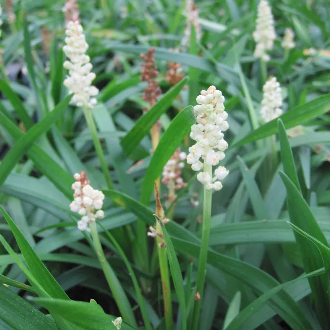 Все літо, з червня по жовтень, залежно від клімату, із пучка мальовничого листя виростають квітконоси, що несуть довгі ниткоподібні та трубчасті суцвіття. Liriope має красиві вертикальні суцвіття. Вони утворені численними маленькими квіточками-дзвіночками з 6 восковими листочками оцвітини, згрупованими по 3-8 на коротких квітконіжках.