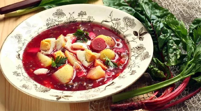 На товстій тертці натерти овочі: буряк, моркву, корінь петрушки. Розігріти бульйон, додати терті овочі, лист селери, ароматний перець. Варити 15 хвилин на слабкому вогні під кришкою. Поріжте листя буряка разом зі стеблами на дрібні шматочки. Додати в суп, варити 7 хвилин. Додати лимонний сік або винний оцет, приправити сіллю, перцем. Подавати з яйцями, картоплею, кропом, за бажанням зі столовою ложкою сметани.