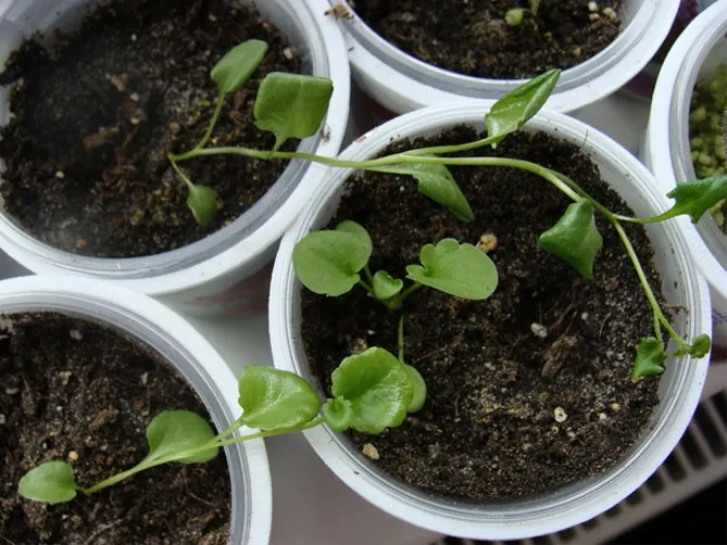 Періодично слід помірно зволожувати грунт. Приблизно через 2 тижні з'являться сходи. Від укриття їх потрібно звільняти поступово. З'явилися паростки дуже тендітні, тому для їх зрошення потрібно використовувати дрібнодисперсний розпилювач. Після того як з'явиться два-три листочка, сіянці слід розсадити. Вибираючи найміцніші паростки, їх потрібно пересаджувати в окремі ємності по 4-5 штук. Надалі при вирощуванні розсади температуру повітря можна знизити до 15-18 °С.