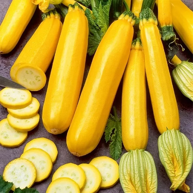 - Жовтоплодний. Насіння сорту висівають у відкритий ґрунт в останніх числах травня. З моменту появи сходів до формування першого плоду проходить приблизно 7 тижнів. Кожен кущ здатний дати приблизно 9,5 кг і цю урожайність можна підвищити, проводячи регулярні розпушування ґрунту, вносячи мінеральні добрива в процесі вегетації. Кабачок має правильну звичну форму. Шкірка досить тонка, м'якоть без волокон, бежевого забарвлення. Маса одного плоду в межах 1 кг, плоди легко перевозити, зберігати взимку.
