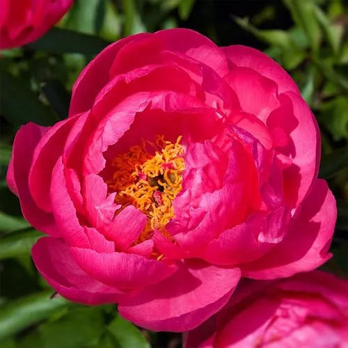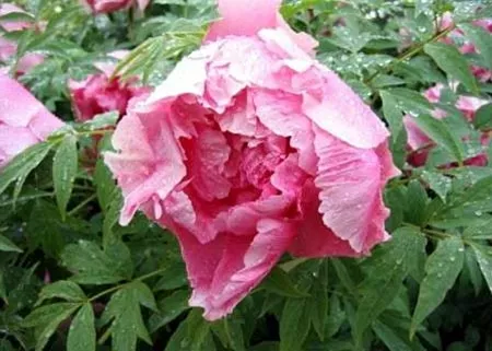 | Піон Вітмана | Особливість даного сорту – соковитий красно-рожевий колір квіток з рожевим опушенням у середині. Листяна складова зелена, черешки – алі. | ![]() |
