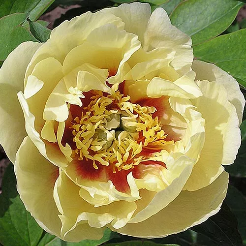 | Енн Беррі Казенс | Високорослі піони, що витягуються до метра заввишки. Купи напіврозлогі. Це червоні піони з рожевуватим відливом та жовтим тичининним помпоном посередині. Тип – напівмахровий. | ![]() |
