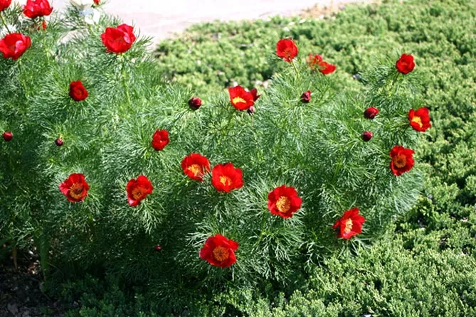 Також цікавий вид тонколистого піона (paeonia tenuifolia), заввишки 30-50 сантиметрів. Ніжна квітка розцвітає вже на початку травня. Він зазвичай має темно-рожеві квітки та дуже характерне листя з ниткоподібними ділянками, що нагадують листя фенхелю.