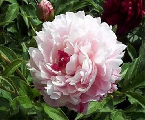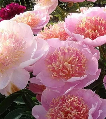 | Піон Ред Чарм | Ароматний сорт з красивими пишними багряними суцвіттями. Стебла потребують вертикальної фіксації. Рослина довго зберігає свіжість після зрізу. | ![]() |