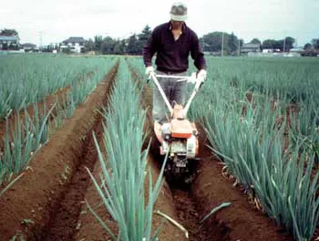 В Японії для цієї мети спеціально розроблені машини. В дачних умовах можна використовувати мотику, підгортаємо лише двічі – в кінці червня та на початку серпня. У фермерських господарствах можна скористатися окучником картоплі. Кожне наступне присипання ґрунтом по мірі росту цибулі викликає подовження знебарвлених стебел на 5-10 см. Останнє підгортання потрібно зробити за місяць до запланованого збору урожаю.