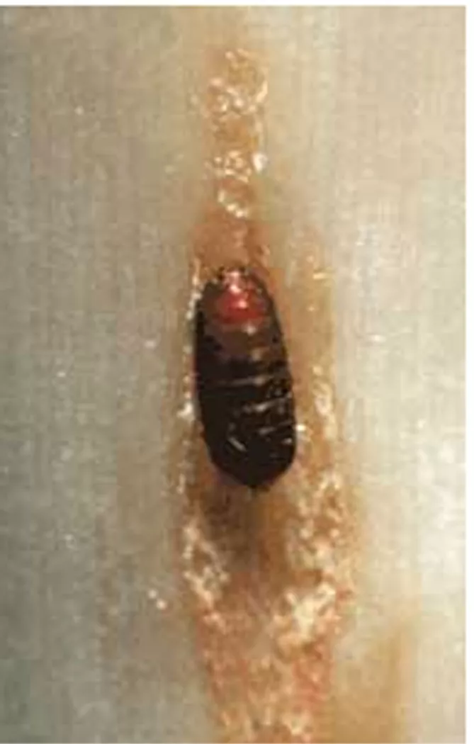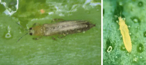 Фото. Трипси: зліва – доросла самка, справа – личинка.