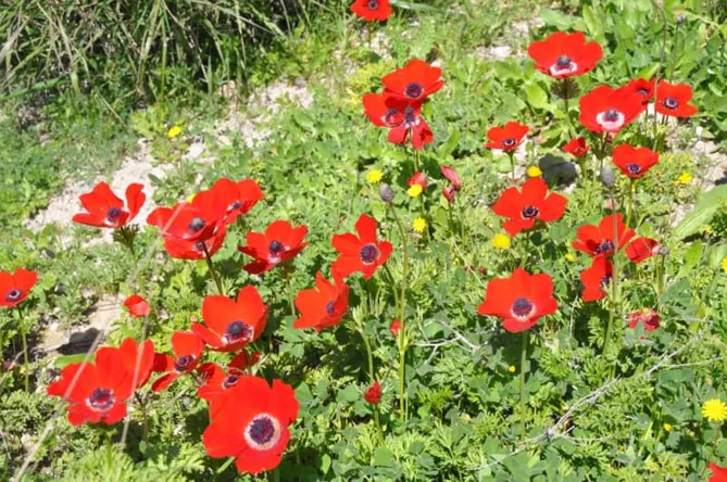 Корончасті анемони мають червоний колір і здалеку нагадують крихітні квітучі польові маки. Анемони виростають з підземних бульб. Квітки бувають різного забарвлення – червоного, білого, рожевого, блакитного, фіолетового.