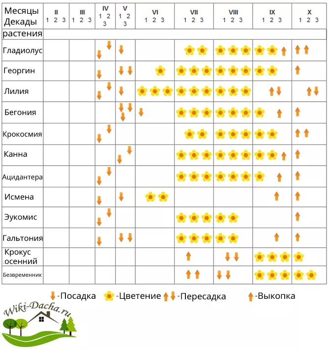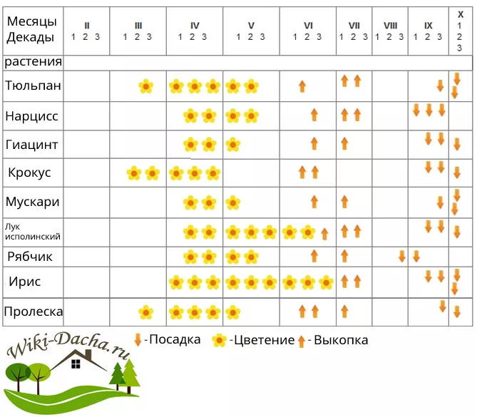 У представленій нижче таблиці можна ознайомитися, коли саджати цибулинні квіти, які саджають восени під зиму, коли викопувати і коли квітнуть різні види.