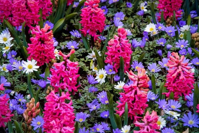 Фото. Цибулинні квіти рожеві гіацинти на клумбі красиво виглядають у весняній комбінації цибулинних рослин, контрастуючи з синіми анемонами.
