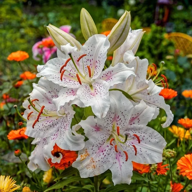 Кількість барвистих сортів королівських лілій, ботанічних і східних гібридів настільки велика, що ними можна заповнити не один, а кілька садів. Лілія – квітка вражаюча у всіх відношеннях. Її квіти бувають у всій гамі однотонних або різнокольорових відтінків, вони великі, чудово пахнуть, а коли з'являються на клумбі, залишаються протягом усього літа. Рослини можуть досягати 180 см у висоту і потребують великого простору на клумбі. Східні лілії трохи вимогливіші, але вони забезпечать постійне пишне цвітіння з травня до вересня.