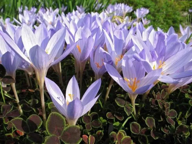 Дуже схожий на крокус квітка пізньоцвіт осінній, часто ці дві квітки плутають навіть досвідчені садівники. Їх відрізняє лише поведінка в саду. Крокуси спочатку цвітуть, а потім дають листя, пізньоцвіти випускають листя ранньою весною, потім засихають і зникають, щоб випустити квіти восени – з серпня по жовтень. Вони красиві, бувають різних кольорів: від білого до блідо-рожевого, пурпурного. Грона цих квітів чудово виглядають на траві, і якщо садівник утримається від стрижки газону в цей період, вони будуть його прикрасою всю осінь.