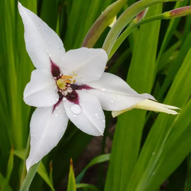 Гладіолус (Шпажник) Мюріел або ацидантера досягає висоти 45-60 см. Довгі, зелені, загострені листя є фоном для ефектних квітів. Квіти великі, білі з фіолетовим горлом, дуже приємно пахнуть вночі. Розпускаються в кінці літа – на початку осені – з серпня. Квітки в суцвітті розкриваються послідовно.