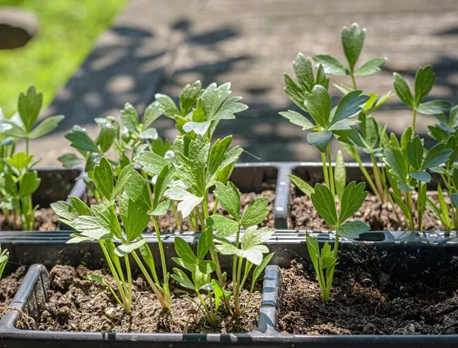 Горщики обов'язково повинні мати отвори, через які зливається зайва вода. На дні варто зробити дренажний шар, який запобігає надмірному зволоженню коренів. Наступний шар – грунт, змішаний з перегноем. Для вирощування з насіння любисток сіють у горщики, як і в грунт на глибину 1-1,5 см і тримають субстрат вологим. Трава, посіяна навесні в горщики, сходить приблизно через 20 днів.