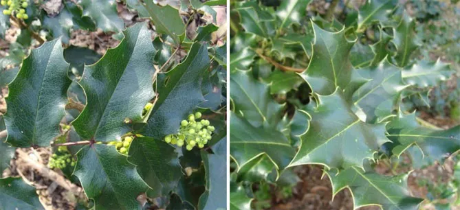 Фото. Через форму листя неотруйну магонію легко сплутати з отруйним падубом. Зліва – лист магонії, справа – падуба.