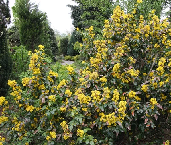Магонія середня (Mahonia х media) – гібрид, вічнозелений кущ. Шкірясте листочки складної форми прикрашають рослину цілий рік – восени червоніє, не опадає. Висота – 2-2,5 м. Не повністю морозостійка. Замерзає в Україні, може рости в регіонах з м'яким кліматом.