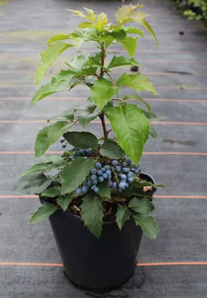 - Плід – пурпурні плоди з синім нальотом, овальні, зібрані в грона, дозрівають у липні-серпні. Якщо в саду росте одна рослина, вона дає мало плодів. Щоб плодів було вдосталь, необхідно мінімум 2 рослини, сорт значення не має. Для перенесення пилку з квітки на квітку потрібні комахи, бджоли відвідують рослину досить охоче. Ягоди магонії їстівні, насіння отруйні.