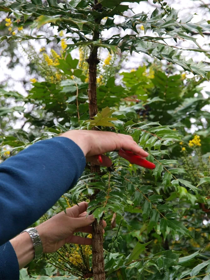 Однак краще обмежитися корекцією форми куща та санітарною обрізкою. Після зими засохлі і зламані пагони необхідно видалити. Якщо ви занадто сильно обрізаєте магонію, вона буде гірше цвісти і приноситиме менше плодів. Бажано обрізати її регулярно щороку, але не дуже інтенсивно. Це робить кущ щільним, він дає більше квітів.