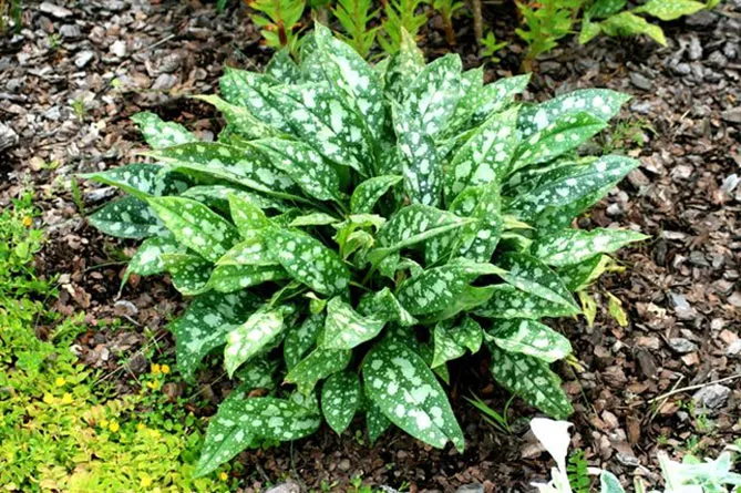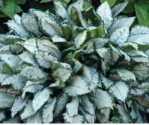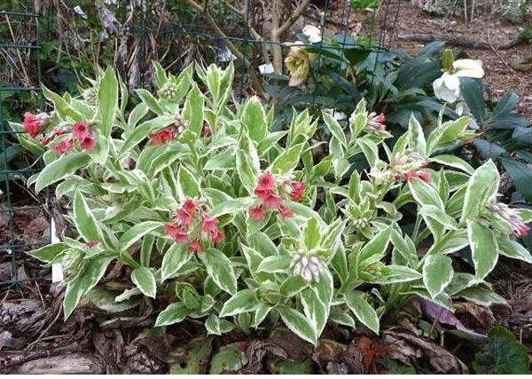 - «Муншайн» Moonshine – яскравий багаторічник з пишною декоративною листкою і привабливими весняними квітами, сягає 30-45 см. Рослина радує великим скупченням овальних блискучих плямистих листків. Молоді листові пластинки світло-зеленого кольору з сріблястими плямами. Старі – сріблястого кольору з цікавою облямівкою темно-зеленого кольору. Багато цвіте з квітня. Над декоративним пучком різнобарвних листків з'являються красиві рожеві квіти у формі дзвіночків, які в міру дозрівання стають світло-блакитними.