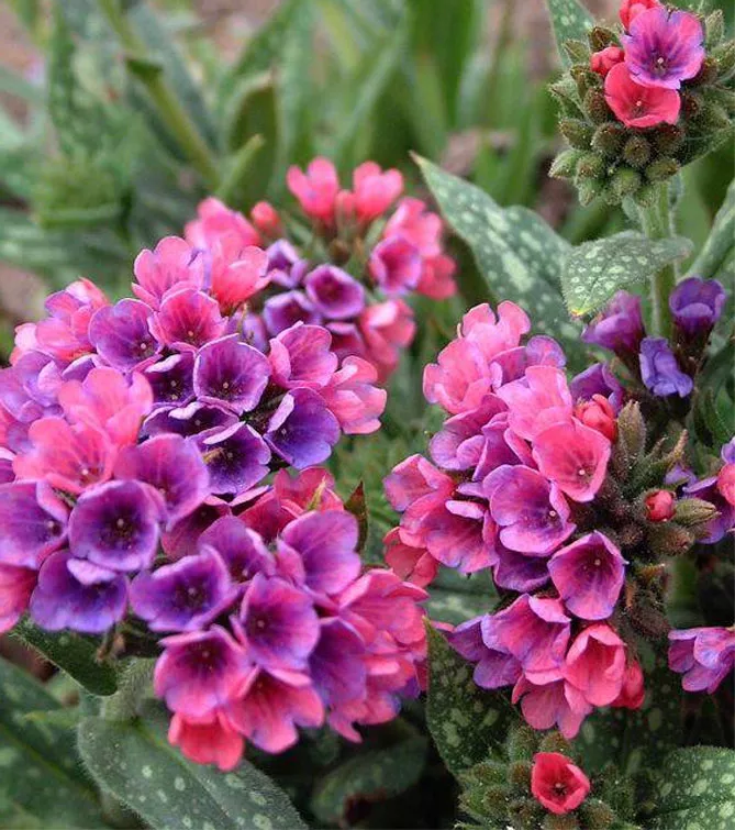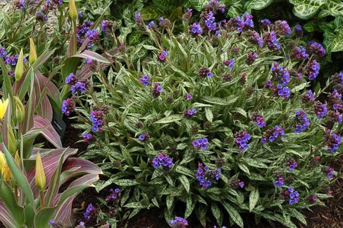 - «Блю міст» Blue Mist – утворює на одній рослині квіти двох кольорів – пурпурового та рожевого. Цвітіння починається з березня. Відрізняється яскраво забарвленими зеленими листками, вкритими сріблястими плямами. Винятково декоративні листки не змінюють забарвлення протягом усього вегетаційного періоду рослини. Висота: 30-40 см.