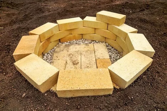 - Виконуємо укладання стін вогнища. При укладанні стін цеглини кладуть так, щоб вони перекривали одна одну. Закріплюємо вогнетривким розчином. Ретельно перевіряйте рівень кожного шару. Останнє коло цеглин має виступати на 5-10 см над рівнем землі.