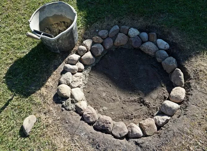 - По зовнішньому колу укладаємо товстий шар бетонної суміші, на неї перший шар каменів. Потім кладемо другий шар каменів зі зміщенням назовні приблизно на 5 см. Ця піч не має вертикальних стінок, плавно розширюється. Під другим шаром каменів також кладемо бетонну суміш.