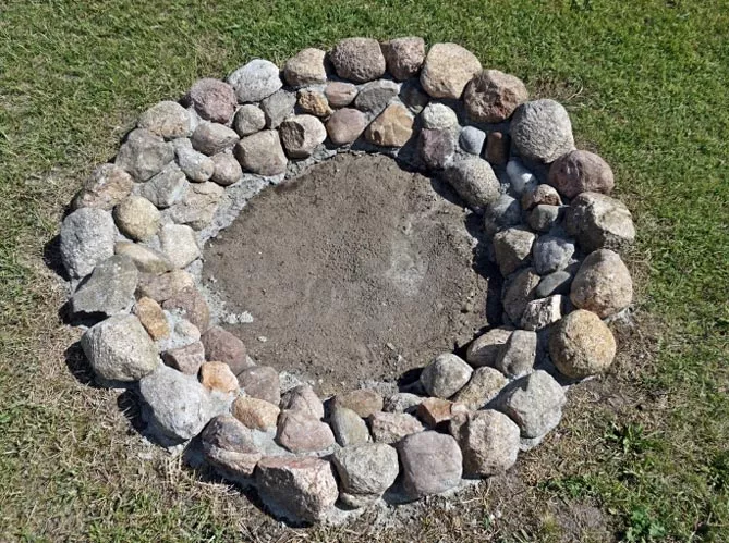 - Третій шар виступає над рівнем землі. Ця природна межа не дозволяє поширюватися вогню. Камені укладають по одному, процес укладання займає 1 годину. Через кілька днів трава навколо каменів виросте і закриє надлишок бетону.