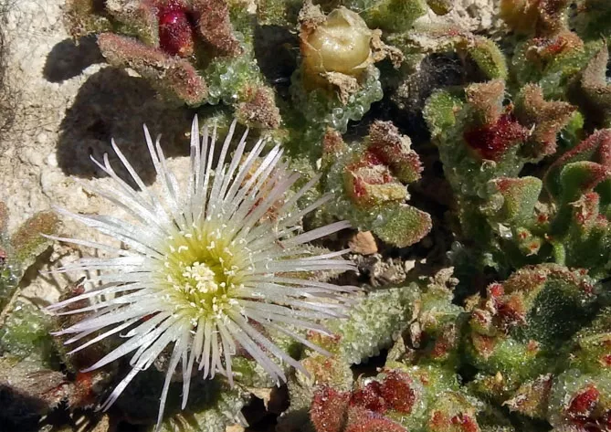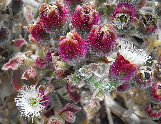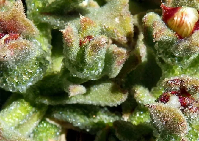 Його назви кришталева або крижана трава пов'язані з зовнішнім виглядом листя, дуже оригінальним через великі фолікулярні клітини.