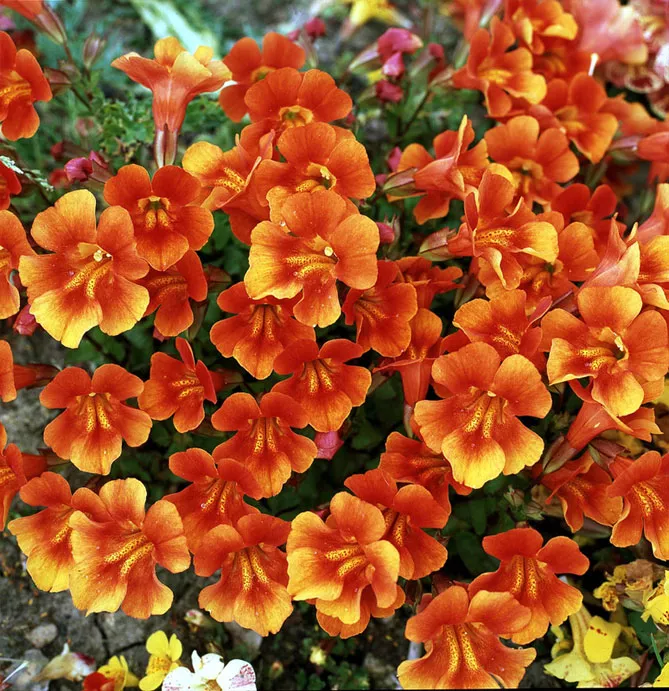 Однорічна рослина мімулюс мідно-червоний (Mimulus cupreus) цвіте з червня по вересень великими трубчастими квітками, пелюстки мідно-оранжеві з жовтим зівом. Висота: 10-20 см. Стелячі стебла вкриті дрібними зубчастими листочками з помітними жилками. Морозостійкий багаторічник, культивується як однорічник.
