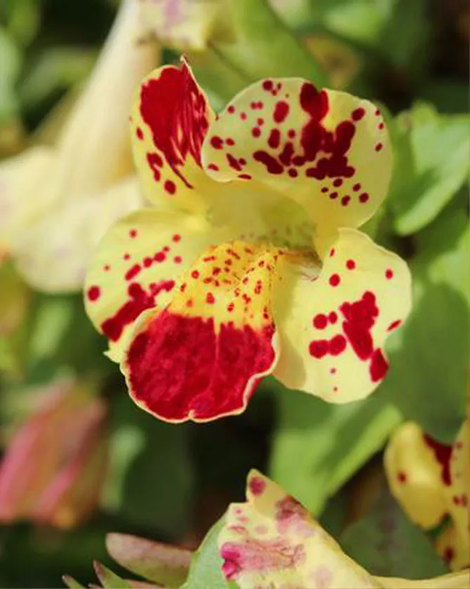 Двоколірні великі квітки мімулюса з'являються на верхівках пагонів на початку літа (червень-липень), вражаючи інтенсивністю забарвлення. Крім цікавої форми, їхня відмінна риса – рисунок у вигляді крихітних численних цяток, видимих на нижній пелюстці квітки у більшості сортів. Квітки залежно від сорту бувають різних кольорів – білі, жовті, оранжеві, рожеві, червоні, бордові, різнокольорові, вкриті контрастними, нерегулярними плямами та цятками.