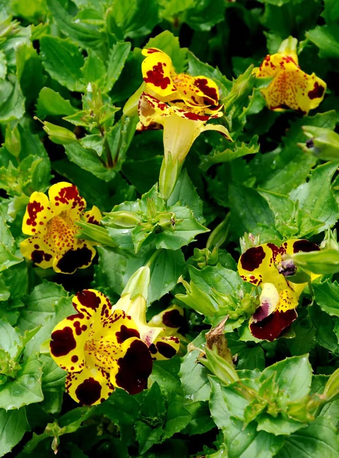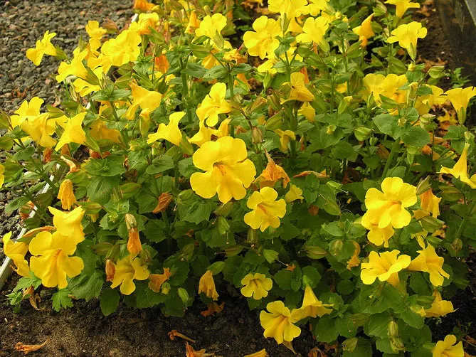 Витривалий багаторічний вид мімулюс крапчастий (Mimulus guttatus) цвіте у травні-червні маленькими яскраво-жовтими воронкоподібними квітками з червоними або коричневими цятками на задній стінці. Квітки поєднуються в грона. Висота рослини: 30 см, ширина: 60-100 см. Це ґрунтопокривна рослина, що вкорінюється на рівні вузлів. Листя овальне, зубчасте, зелене. Морозостійкість: -15-20 °С. Це хороший ґрунтопокривник.