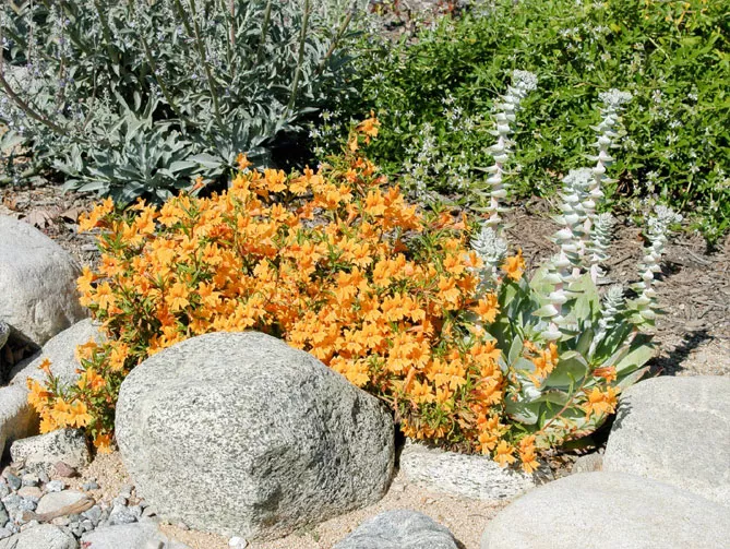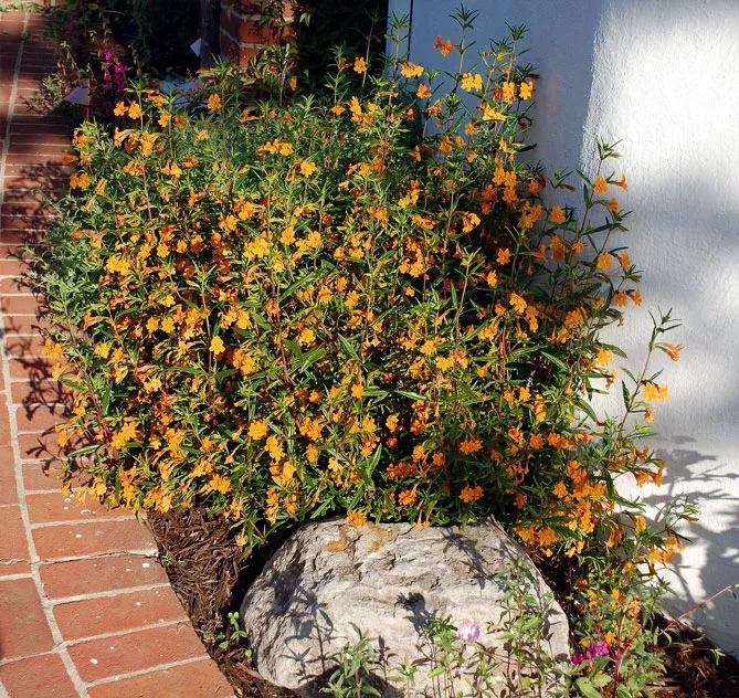 Губастик або мімулюс помаранчевий (Mimulus aurantiacus) родом з Північної Америки. Цвітіння: з червня по жовтень. Квіти великі, ніжно-помаранчеві, у формі довгої труби з зубчастими пелюстками, хвилястими по краях. Висота кущика: 60- 120 см, ширина 100 см. Кущ мало розгалужений, рихлий. Листя вузьке, вічнозелене, блискуче. Рослини морозостійкі до -10-12 °C у дуже добре дренованому ґрунті. Засухостійкий чагарник. Можна вирощувати у великому горщику.