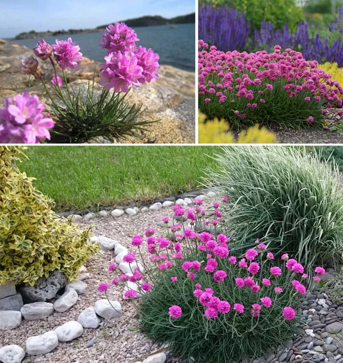 Armeria maritima – низькі, що нагадують подушку багаторічні низькорослі квіти, що ростуть до 10 см з вузькими трав'янистими листками. Головки суцвіть розташовані на тонких стеблах завдовжки 20 см. Цвіте з травня по вересень у білому, рожевому кольорі. Схема посадки: 11 рослин на 1 м². Армерія особливо рекомендується для сонячних кам'янистих садів з легким ґрунтом.