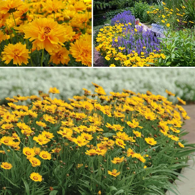 Coreopsis grandiflora – багаторічник для дачі висотою куща до 80 см. З червня по жовтень створює жовті квіткові кошики, індивідуально розміщені на стеблах. На рабатці висаджують 7 штук на 1 кв.м. Деякі сорти цих багаторічних квітів мають поодинокі кошики з коричневими плямами на коренях пелюсток.
