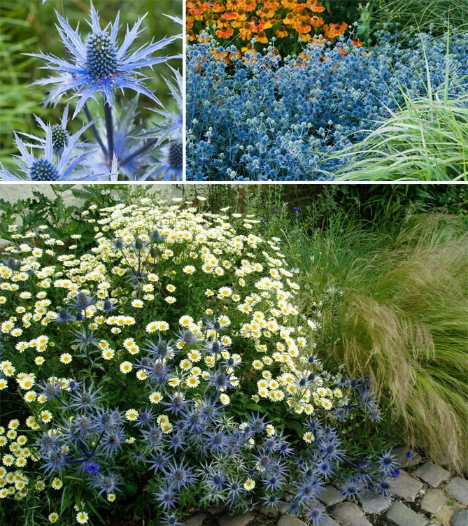 Багаторічна рослина Eryngium planum – часто росте на сухих пустках, висотою до метра. Синеголовник утворює жорсткі, розгалужені пагони. Квіткові головки маленькі, численні, сферичні, блакитнуваті. Це рослини, що квітнуть всю осінь і літо – червень-вересень. Добре представлені на квітниках, можна посадити в кількості 5 штук на 1 м².