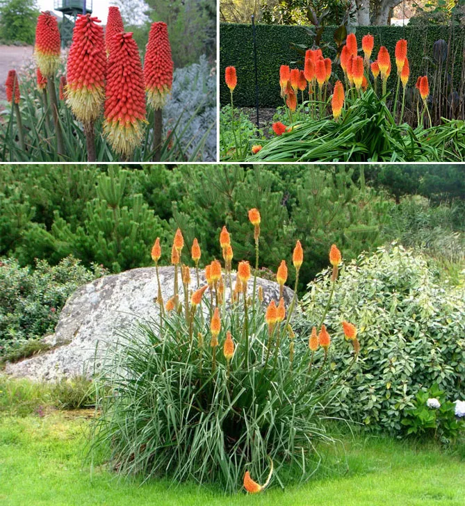 Kniphofia uvaria – велична і екзотична африканська багаторічна рослина висотою 100 см. Кніфофія створює рівновіддалене листя і щільні суцвіття, що квітнуть з червня по вересень. Унизу суцвіття жовті, вгорі – помаранчеві, майже червоні. Кніфофія вимагає родючого ґрунту і сонячної позиції. Варто посадити рослину в невеликих групах по 5 штук на 1 м².