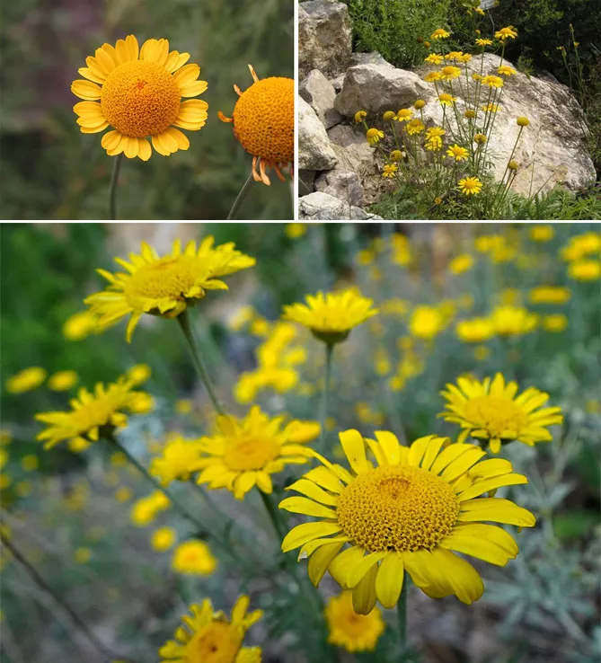Anthemis tinctoria – квіти родини айстрових виростають до 60 см, утворюючи жовті кошики діаметром 2,5-3,5 см, що квітнуть все літо і осінь, з липня по вересень. Жовту пупавку можна висаджувати на невеликих альпійських гірках невеликими групами по 9 штук на 1 м².