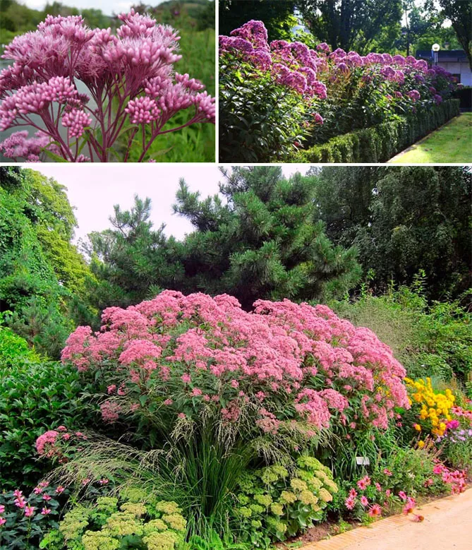 Квітка Eutrochium maculatum – велика, довго ростуча багаторічна рослина, висотою до 2 метрів. Стебло червоно-крапчасте або червоно-жильне. Посконник створює квіткові кошики, рожевого забарвлення, що квітнуть з липня по вересень. Плямистий посконник вимагає дуже вологого, лужного ґрунту. Висаджується в кількості 3 штуки на 1 м².