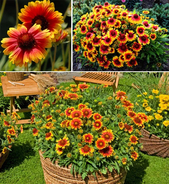 Квіти Gaillardia pulchella – рослина родини соняшникових, росте 60 см, дає великі жовто-червоні квітки. Цвіте недовго, обрізка після першого цвітіння подовжує існування рослини. Росте краще на світлому і родючому ґрунті, висаджена в кількості 7 штук на 1 м².