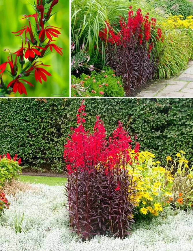 Lobelia cardinalis – квіти родини Дзвоникові з вертикальними, слабо розгалуженими пагонами висотою 1 метр. Стебла часто забарвлені в червоний колір, квітки з'являються з липня по вересень, в залежності від сорту – червоні або рожеві. Лобелія вимагає багатого, постійно вологого ґрунту. Прекрасно росте у водних садах, висаджена в кількості 5 штук на 1 м².