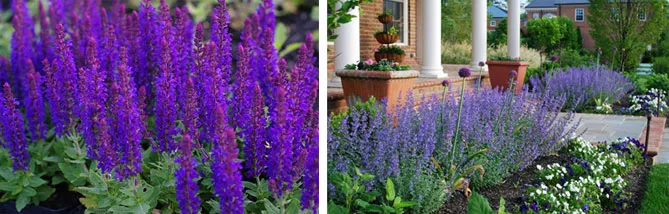 - Гідно виглядають рослини з фіолетовими квітами, такі як безцінна для сухих ґрунтів, особливо кам'янистих садів – котяча м'ята або шавлія пухнаста з численними інтенсивно забарвленими сортами, наприклад, «Ostfriesland» або «Mainacht». Варто врахувати, що з цими багаторічниками красиво компонують кущики з рожевими або білими квітками, що квітнуть протягом усього літа.