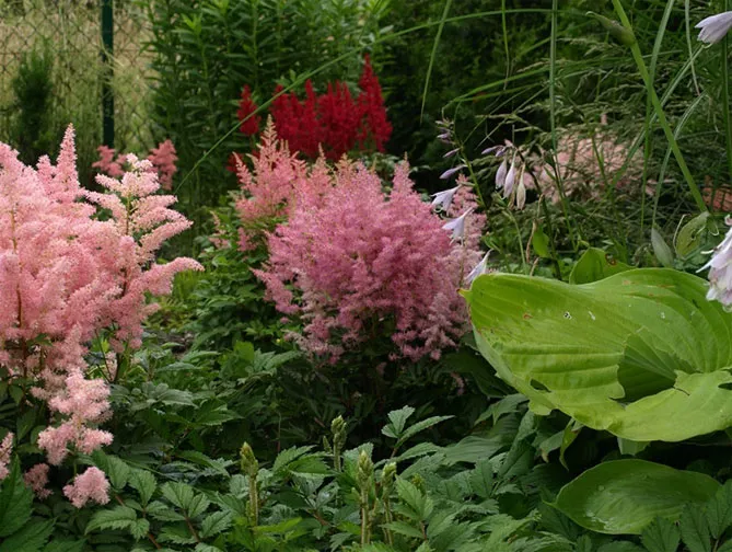 У затінених місцях більша частина квітучих багаторічників росте погано. Тут розкриваються переваги інших рослин, наприклад, Астильби. Для задернення підійде низький варіант Astilbe chinensis var. pumila. На відміну від інших видів, він до певної міри переносить повне сонце і навіть посуху. Суцвіття, з'являються з серпня по листопад, фіолетово-рожеві. Деякі з вищих астильб ростуть до 80-120 см, характеризуються тривалим цвітінням. Кущики дозволяють створювати ефектні композиції з різних сортів – «Глют» (червоний) і «Purpurlanze» (бузковий).
