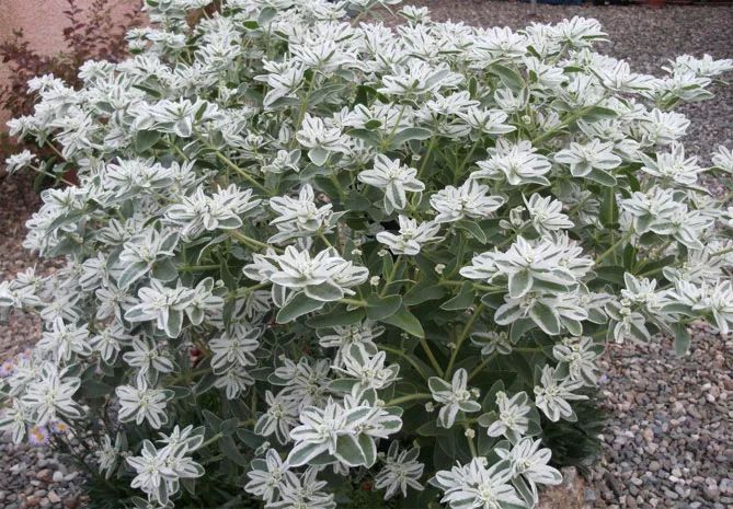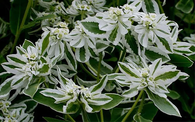 Один из наиболее любимых садовых видов – окаймленный молочай (E. marginata) высотой 60 см. Может достигать 100 см в высоту, но обычно достигает меньших размеров. Растение имеет густую окраску, приподнятые, жесткие, ветвистые побеги. Цветет летом (июль-август), развивая на верхушках побегов мелкие цветки, собранные в небольшие плотные соцветия. Украшение растения – крупные, яйцевидные, зеленые листья с широкой белой каймой, которая почти полностью покрывает пластинку молодых листьев.